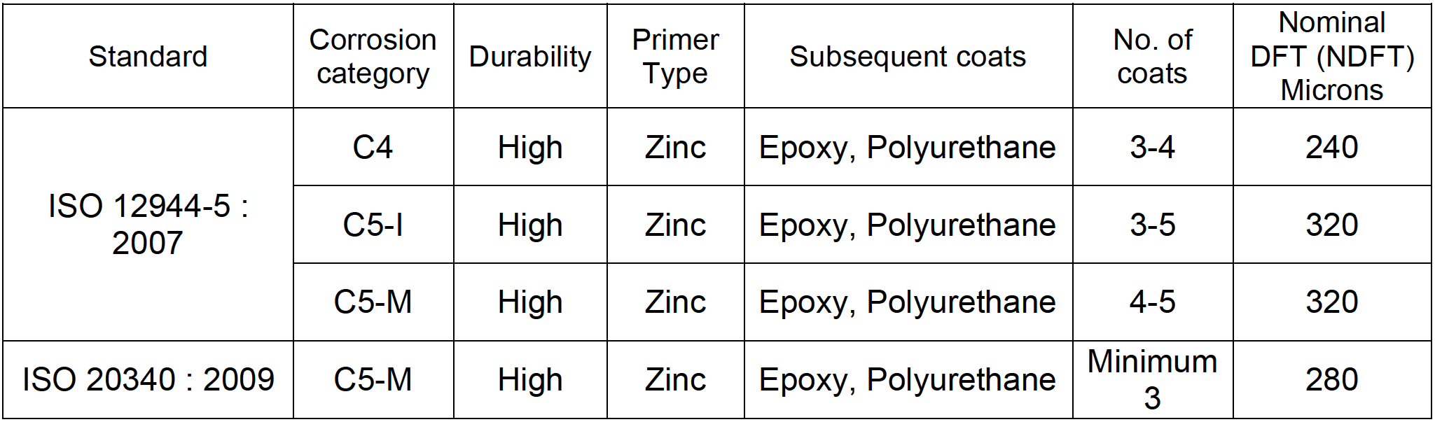 表1(如下)显示了两个常见标准ISO 12944-5 : 2007和ISO 20304 : 2009的例外情况。